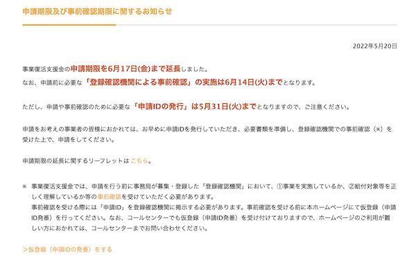 事業復活支援金を申請予定の方は、期限が延びたことに安心することなく、ひとまず5月中に申請IDの発行を行なっておく必要があります。